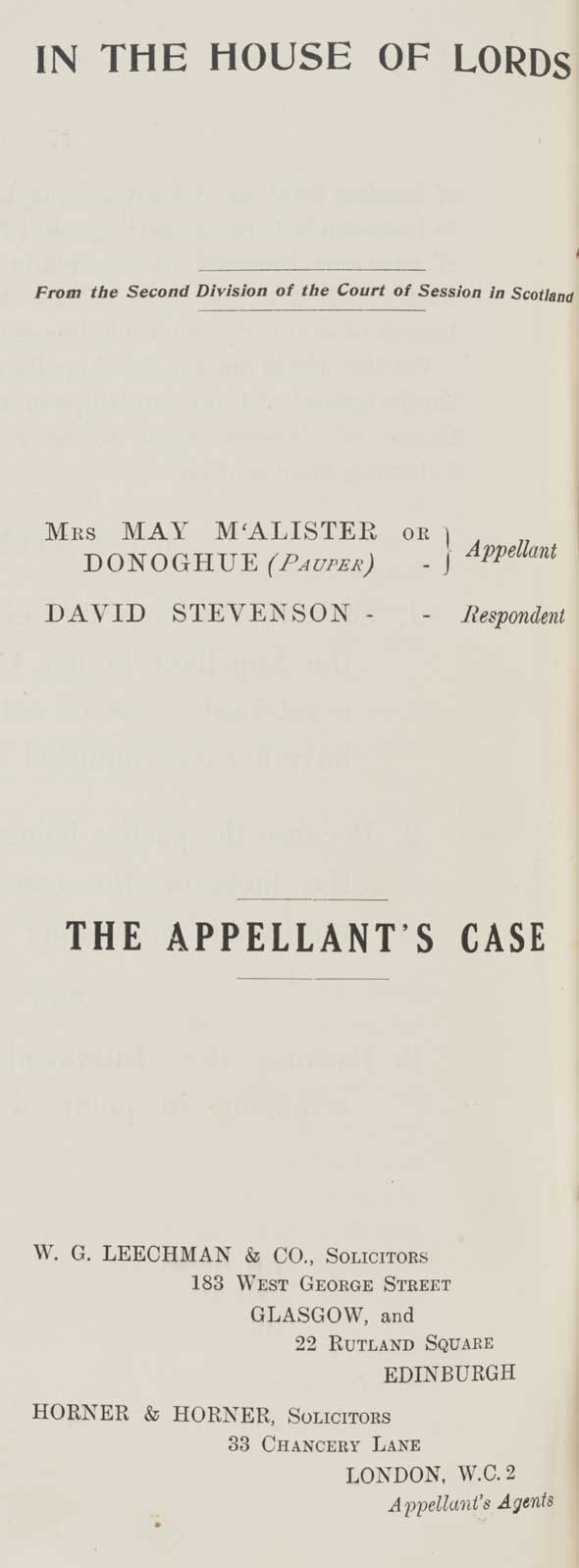 THE APPELLANT’S CASE W. G. LEECHMAN & CO., SOLICITORS HORNER & HORNER, SOLICITORS |