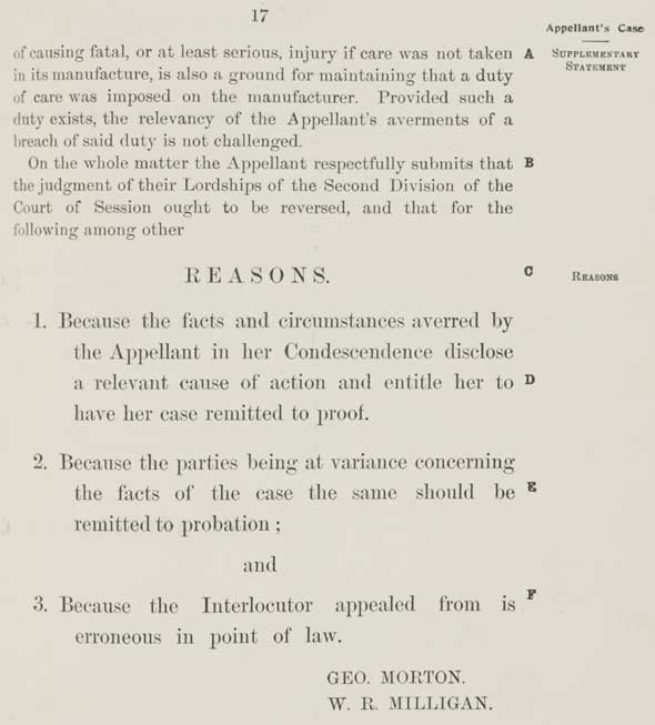 17 of causing fatal, or at least serious, injury if care was not taken in its manufacture, is also a ground for maintaining that a duty of care was imposed on the manufacturer. Provided such a duty exists, the relevancy of the Appellant's averments of a breach of said duty is not challenged. On the whole matter the Appellant respectfully submits that the judgment of their Lordships of the Second Division of the Court of Session ought to be reserved, and that for the following among other |
