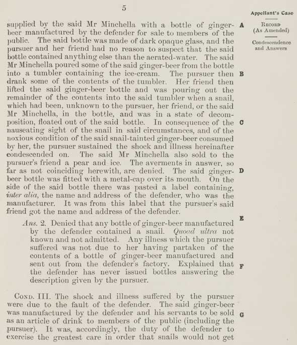 5 supplied by the said Mr. Minchella with a bottle of ginger-beer manufactured by the defender for sale to members of the public. The said bottle was made of dark opaque glass, and the pursuer and her friend has no reason to suspect that the said bottle contained anything else than the aerated-water. The said Mr Minchella poured some of the said ginger-beer from the bottle into a tumbler containing the ice-cream. The pursuer then drank some of the contents of the tumbler. Her friend then lifted the said ginger-beer bottle and was pouring out the remainder of the contents into the said tumbler when a snail, which had been, unknown to the pursuer, her friend, or the said Mr Minchella, in the bottle, and was in a state of decomposition, floated out of the said bottle. In consequence of the nauseating sight of the snail in said circumstances, and of the noxious condition of the said snail-tainted ginger-beer consumed by her, the pursuer sustained the shock and illness hereinafter condescended on. The said Mr Minchella also sold to the pursuer's friend a pear and ice. The averments in answer, so far as not coinciding herewith, are denied. The said ginger-beer bottle was fitted with a metal-cap over its mouth. On the side of the said bottle there was pasted a label containing, inter alia, the name and address of the defender, who was the manufacturer. It was from this label that the pursuer's said friend got the name and address of the defender. Ans. 2. Denied that any bottle of ginger-beer manufactured by the defender contained a snail. Quoad ultra not known and not admitted. Any illness which the pursuer suffered was not due to her having partaken of the contents of a bottle of ginger-beer manufactured and sent out from the defender's factory. Explained that the defender has never issued bottles answering the description given by the pursuer. COND. III. The shock and illness suffered by the pursuer were due to the fault of the defender. The said ginger-beer was manufactured by the defender and his servants to be sold as an article of drink to members of the public (including the pursuer). It was, accordingly, the duty of the defender to exercise the greatest care in order that snails would not get |