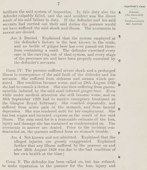 7 facilitate the said system of inspection. In this duty also the defender culpably failed, and the said accident was the direct result of his said failure in duty. If the defender and his said servants had carried out their said duties the pursuer would not have suffered the said shock and illness. The averments in answer are denied. Ans. 3. Denied. Explained that the system employed at the defender's factory is the best known in the trade, and no bottle of ginger-beer has ever passed out there-from containing a snail. The defender exercised every care in the carrying out of that system, and every stage of the processes are and have been properly executed by the defender's servants. COND. IV. The pursuer suffered severe shock and a prolonged illness in consequence of the said fault of the defender and his servants. She suffered from sickness and nausea which persisted. Her condition became worse, and on 29th August 1928 she had to consult a doctor. She was then suffering from gastroenteritis induced by the said snail-infected ginger-beer. Even while under medical attention she still became worse, and on 16th September 1928 had to receive emergency treatment at the Glasgow Royal Infirmary. She vomited repeatedly, and suffered from acute pain in the stomach, and from mental depression. She was rendered unfit for her employment. She has lost wages and incurred expense as the result of her said illness. The sum sued for is a reasonable estimate of the loss, injury and damage she has sustained as condescended on. The averments in answer are denied. Prior to the incident condescended on, the pursuer suffered from no stomach trouble. Ans. 4. Not known and not admitted. Explained that the alleged injuries are grossly exaggerated. Explained further that any illness suffered by the pursuer on and after 26th August 1928 was due to the bad condition of her own health at the time. COND. V. The defender has been called on, but has refused, to make reparation to the pursuer for the loss, injury and |