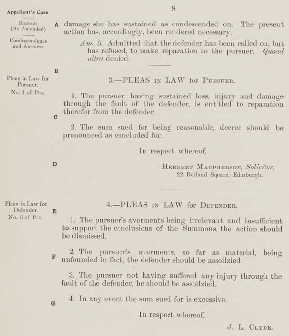 3. — PLEAS IN LAW for PURSUER. 1. The pursuer having sustained loss, injury and damage through the fault of the defender, is entitled to reparation therefor from the defender. 2. The sum sued for being reasonable, decree should be pronounced as concluded for. In respect whereof, HERBERT MACPHERSON, Solicitor, |