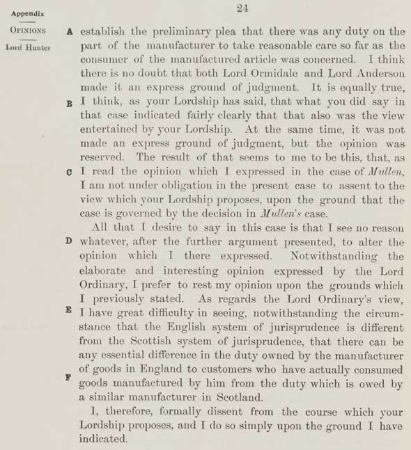 24 establish the preliminary plea that there was any duty on the part of the manufacturer to take reasonable care so far as the consumer of the manufactured article was concerned. I think there is no doubt that both Lord Ormidale and Lord Anderson made it an express ground of judgment. It is equally true, I think, as your Lordship has said, that what you did say in that case indicated fairly clearly that that also was the view entertained by your Lordship. At the same time, it was not made an express ground of judgment, but the opinion was reserved. The result of that seems to me to be this, that, as I read the opinion which I expressed in the case of Mullen, I am not under obligation in the present case to assent to the view which your Lordship proposes, upon the ground that the case is governed by the decision in Mullen's case. All that I desire to say in this case is that I see no reason whatever, after the further argument presented, to alter the opinion which I there expressed. Notwithstanding the elaborate and interesting opinion expressed by the Lord Ordinary, I prefer to rest my opinion upon the grounds which I previously stated. As regards the Lord Ordinary's view, I have great difficulty in seeing, notwithstanding the circumstance that the English system of jurisprudence is different from the Scottish system of jurisprudence, that there can be any essential difference in the duty owned by the manufacturer of goods in England to customers who have actually consumed goods manufactured by him from the duty which is owed by a similar manufacturer in Scotland. I, therefore, formally dissent from the course which your Lordship proposes, and I do so simply upon the ground I have indicated. |