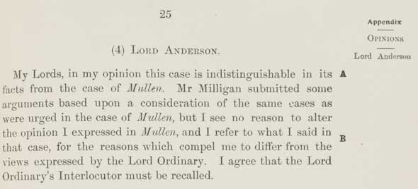 25 (4) LORD ANDERSON. My Lords, in my opinion this case is indistinguishable in its facts from the case of Mullen. Mr Milligan submitted some arguments based upon a consideration of the same cases as were urged in the case of Mullen, but I see no reason to alter the opinion I expressed in Mullen, and I refer to what I said in that case, for the reasons which compel me to differ from the views expressed by the Lord Ordinary. I agree that the Lord Ordinary's Interlocutor must be recalled. |