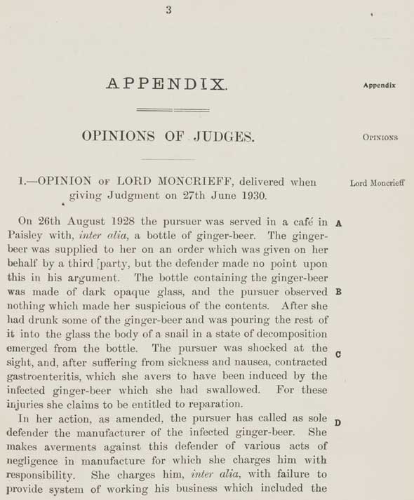 1.—OPINION OF LORD MONCRIEFF, delivered when giving Judgment on 27th June 1930 On 26th August 1928 the pursuer was served in a café in Paisley with, inter alia, a bottle of ginger-beer. The ginger-beer was supplied to her on an order which was given on her behalf by a third party, but the defender made no point upon this in his argument. The bottle containing the ginger-beer was made of dark opaque glass, and the pursuer observed nothing which made her suspicious of the contents. After she had drunk some of the ginger-beer and was pouring the rest of it into the glass the body of a snail in a state of decomposition emerged from the bottle. The pursuer was shocked at the sight, and, after suffering from sickness and nausea, contracted gastroenteritis, which she avers to have been induced by the infected ginger-beer which she had swallowed. For these injuries she claims to be entitled to reparation. In her action, as amended, the pursuer has called as sole defender the manufacturer of the infected ginger-beer. She makes averments against the defender of various acts of negligence in manufacture for which she charges him with responsibility. She charges him, inter alia, with failure to provide system of working his business which included the |