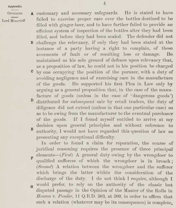 4 customary and necessary safeguards. He is stated to have failed to exercise proper care over the bottles destined to be filled with ginger-beer, and to have further failed to provide an efficient system of inspection of the bottles after they had been filled, and before they had been sealed. The defender did not challenge the relevancy, if only they had been stated at the instance of a party having a right to complain, of these averments of fault or of resulting loss or damage. He maintained as his sole ground of defence upon relevancy that, as a proposition of law, he could not in his position be charged by one occupying the position of the pursuer, with a duty of avoiding negligence and of exercising care in the manufacture of the goods. He supported his first Plea in Law only by arguing as general proposition that, in the case of the manufacture of goods (unless in the case of 'dangerous goods') distributed for subsequent sale by retail traders, the duty of diligence did not extend (unless in that one particular case) so as to be owing from the manufacturer to the eventual purchaser of the goods. If I found myself entitled to arrive at my decision upon general principles and without reference to authority, I would not have regarded this question of law as presenting any exceptional difficulty. In order to find a claim for reparation, the course of juridical reasoning require the presence of three principle elements—(First) A general duty owing by the wrongdoer to qualified sufferers of which the wrongdoer is in breach; (Second) A relation between the wrongdoer and the sufferer which brings the latter within the consideration of the discharge of the duty. I do not think I require, although I would prefer, to rely on the authority of the classic but disputed passage in the Opinion of the Master of the Rolls in Heaven v. Pender, 11 Q.B.D. 503, at 509, in order to affirm that such relation (whatever may be its consequence) is complete, |
