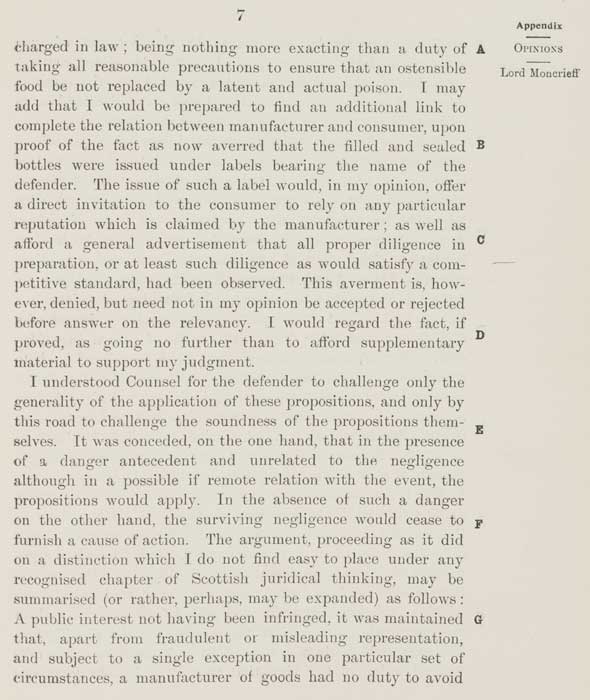 7 charged in law; being nothing more exacting than a duty of taking all reasonable precautions to ensure that an ostensible food be not replaced by a latent and actual poison. I may add that I would be prepared to find an additional link to complete the relation between manufacturer and consumer, upon proof of the fact as now averred that the filled and sealed bottles were issued under labels bearing the name of the defender. The issue of such a label would, in my opinion, offer a direct invitation to the consumer to rely on any particular reputation which is claimed by the manufacturer; as well as afford a general advertisement that all proper diligence in preparation, or at least such diligence as would satisfy a competitive standard, had been observed. This averment is, however, denied, but need not in my opinion be accepted or rejected before answer on the relevancy. I would regard the fact, if proved, as going no further than to afford supplementary material to support my judgment. I understood Counsel for the defender to challenge only the generality of the application of these propositions, and only by this road to challenge the soundness of the propositions themselves. It was conceded, on the one hand, that in the presence of a danger antecedent and unrelated to the negligence although in a possible if remote relation with the event, the propositions would apply. In the absence of such a danger on the other hand, the surviving negligence would cease to furnish a cause of action. The argument, proceeding as it did on a distinction which I do not find easy to place under any recognised chapter of Scottish juridical thinking, may be summarised (or rather, perhaps, be expanded) as follows: A public interest not having been infringed, it was maintained that, apart from fraudulent or misleading representation, and subject to a single exception in one particular set of circumstances, a manufacturer of goods had no duty to avoid |