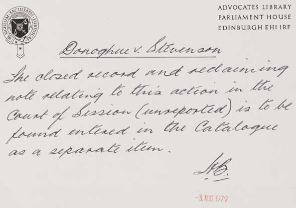 Donoghue v. Stevenson The closed record and reclaiming note relating to this action in the Court of Session (unreported) is to be found entered in the Catalogue as a separate item. |