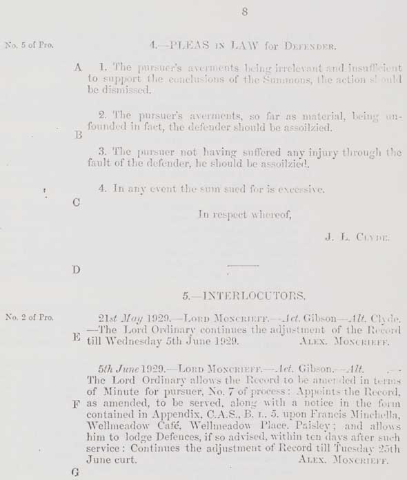 8 4. — PLEAS IN LAW for DEFENDER. 1. The pursuer's averments being irrelevant and insufficient to support the conclusions of the Summons, the action should be dismissed. 2. The pursuer's averments, so far as material, being unfounded in fact, the defender should be assoilzied. 3. The pursuer not having suffered any injury through the fault of the defender, he should be assoilzied. 4. In any event the sum sued for is excessive. In respect whereof, J. L. CLYDE. 5. — INTERLOCUTORS. |