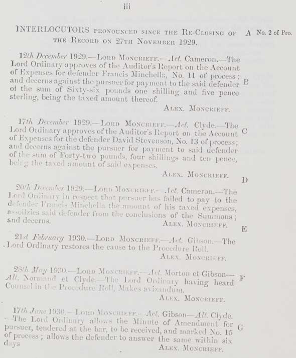 INTERLOCUTORS PRONOUNCED SINCE THE RE-CLOSING OF THE RECORD ON 27TH NOVEMBER 1929. 12th December 1929. — LORD MONCRIEFF. — Act. Cameron. — The Lord Ordinary approves of the Auditor's Report on the Account of Expenses for defender Francis Minchella, No. 11 of process; and decerns against the pursuer for payment to the said defender of the sum of Sixty-six pounds one shilling and five pence sterling being the taxed amount thereof. ALEX. MONCRIEFF. 17th December 1929. — LORD MONCRIEFF. — Act. Clyde. — The Lord Ordinary approves of the Auditor's Report on the Account of Expenses for the defender David Stevenson, No. 13 of process; and decerns against the pursuer for payment to said defender of the sum of Forty-two pounds, four shillings and ten pence, being the taxed amount of said expenses. ALEX. MONCRIEFF. 20th December 1929. — LORD MONCRIEFF. — Act. Cameron. — The Lord Ordinary in respect that pursuer has failed to pay to the defender Francis Minchella the amount of his taxed expenses, assoilzies said defender from the conclusions of the Summons; and decerns. ALEX. MONCRIEFF. 21st February 1930. — LORD MONCRIEFF. — Act. Gibson. — The Lord Ordinary restores the cause to the Procedure Roll. ALEX. MONCRIEFF. 28th May 1930. — LORD MONCRIEFF. — Act. Morton et Gibson — Alt. Normand et Clyde. — The Lord Ordinary having heard Counsel in the Procedure Roll, Makes avizandum. ALEX. MONCRIEFF. 17th June 1930. — LORD MONCRIEFF. — Act. Gibson — Alt. Clyde. — The Lord Ordinary allows the Minute of Amendment for pursuer, tendered at the bar, to be received, and marked No. 15 of process; allows the defender to answer the same within six days |