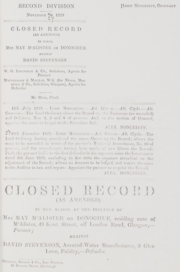 SECOND DIVISION NOVEMBER 27 1929 CLOSED RECORD IN CAUSA MRS MAY M'ALISTER OR DONOGHUE AGAINST DAVID STEVENSON W. G. LEECHMAN & Co., Solicitors, Agents for Pursuer MACPHERSON & MACKAY, W.S. (for Niven, Macniven & Co., Solicitors, Glasgow), Agents for Defender Mr More, Clerk |