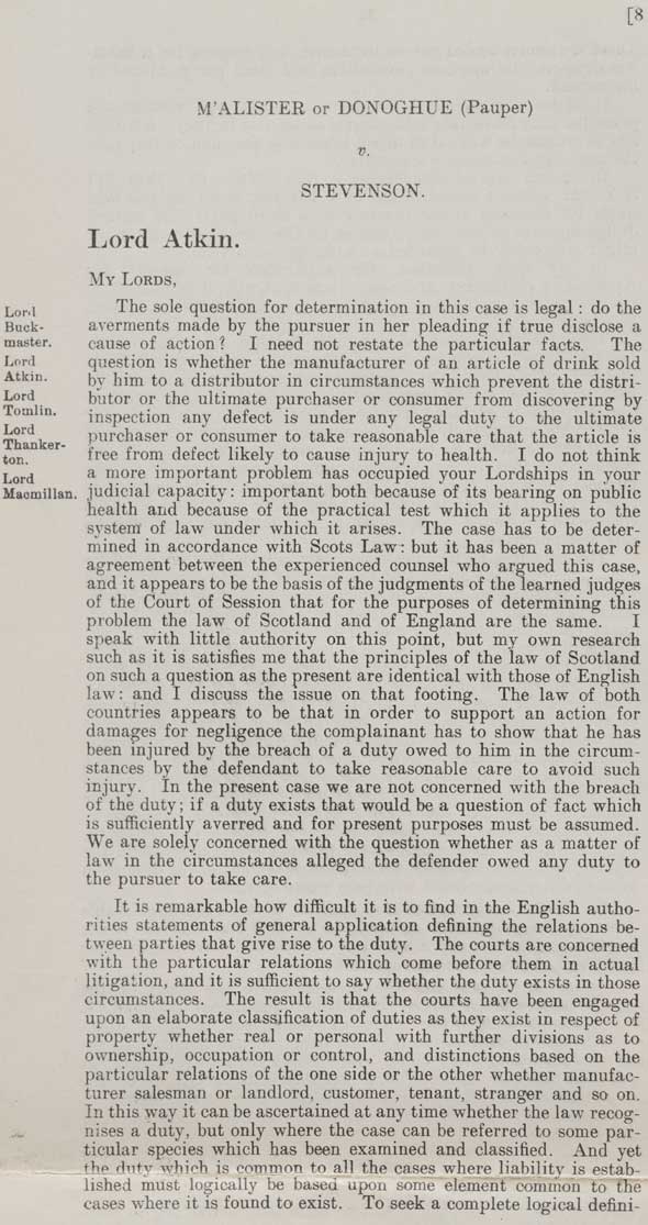 M’ALISTER or DONOGHUE (Pauper) Lord Atkin. MY LORDS, The sole question for determination in this case is legal: do the averments made by the pursuer in her pleading if true disclose a cause of action? I need not restate the particular facts. The question is whether the manufacturer of an article of drink sold by him to a distributor in circumstances which prevent the distributor or the ultimate purchaser or consumer from discovering by inspection any defect is under any legal duty to the ultimate purchaser or consumer to take reasonable care that the article is free from defect likely to cause injury to health. I do not think a more important problem has occupied your Lordships in your judicial capacity: important both because of its bearing on public health and because of the practical test which it applies to the system of law under which it arises. The case has to be determined in accordance with Scots Law: but it has been a matter of agreement between the experienced counsel who argued this case, and it appears to be the basis of the judgments of the learned judges of the Court of Session that for the purposes of determining this problem the law of Scotland and of England are the same. I speak with little authority on this point, but my own research such as it is satisfies me that the principles of the law of Scotland on such a question as the present are identical with those of English law: and I discuss the issue on that footing. The law of both countries appears to be that in order to support an action for damages for negligence the complainant has to show that he has been injured by the breach of duty owed to him in the circumstances by the defendant to take reasonable care to avoid such injury. In the present case we are not concerned with the breach of the duty; if a duty exists that would be a question of fact which is sufficiently averred and for the present purposes must be assumed. We are solely concerned with the question whether as a matter of law in the circumstances alleged the defender owed any duty to the pursuer to take care. It is remarkable how difficult it is to find in the English authorities statements of general application defining the relations between parties that give rise to the duty. The courts are concerned with the particular relations which come before them in actual litigation, and it is sufficient to say whether the duty exists in those circumstances. The result is that the courts have been engaged upon an elaborate classification of duties as they exist in respect of property whether real or personal with further divisions as to ownership, occupation or control, and distinctions based on the particular relations of the one side or the other whether manufacturer salesman or landlord, customer, tenant, stranger and so on. In this way it can be ascertained at any time whether the law recognises a duty, but only where the case can be referred to some particular species which has been examined and classified. And yet the duty which is common to all the cases where liability is established must logically be based upon some element common to the cases where it is found to exist. To seek a complete logical defini- |