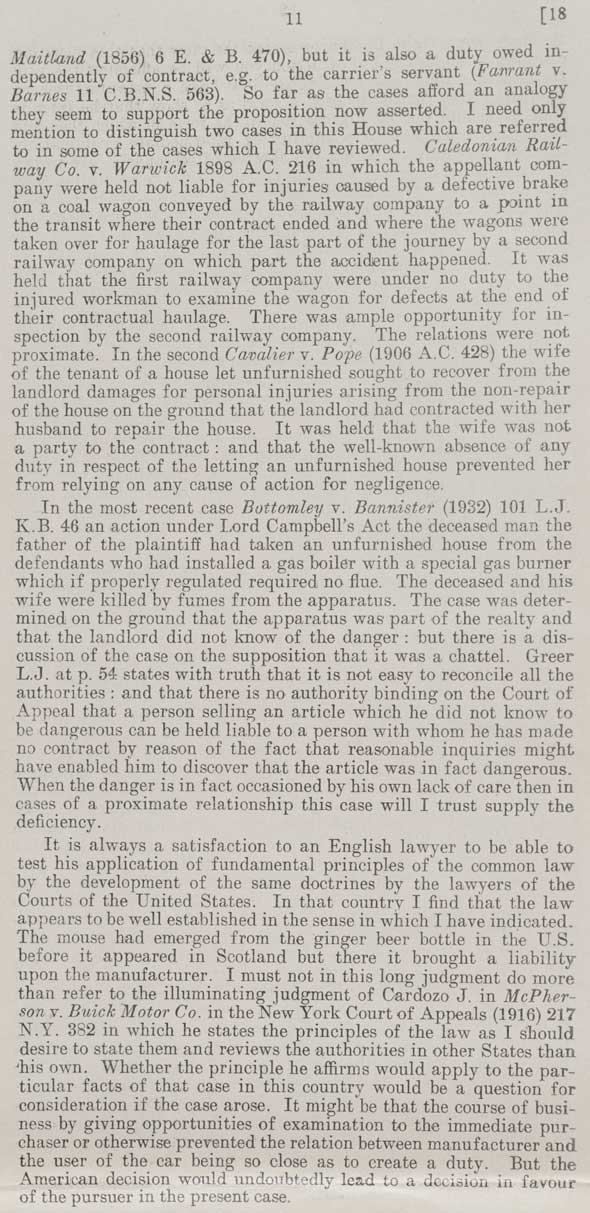 11 Maitland (1856) 6 E. & B. 470), but it is also a duty owed independently of contract. e.g. to the carrier's servant (Fanrant v. Barnes 11 C.B.N.S. 563). So far as the cases afford an analogy they seem to support the proposition now asserted. I need only mention to distinguish two cases in this House which are referred to in some of the cases which I have reviewed. Caledonian Railway Co. v. Warwick 1898 A.C. 216 in which the appellant company were held not liable for injuries caused by a defective brake on a coal wagon conveyed by the railway company to a point in the transit where their contract ended and where the wagons were taken over for haulage for the last part of the journey by a second railway company on which part the accident happened. It was held that the first railway company were under no duty to the injured workman to examine the wagon for defects at the end of their contractual haulage. There was ample opportunity for inspection by the second railway company. The relations were not proximate. In the second Cavalier v. Pope (1906 A.C. 428) the wife of the tenant of the house let unfurnished sought to recover from the landlord damages for personal injuries arising from the non-repair of the house on the ground that the landlord had contracted with her husband to repair the house. It was held that the wife was not a party to the contract: and that the well-known absence of any duty in respect of the letting an unfurnished house prevented her from relying on any cause of action for negligence. In the most recent case Bottomley v. Bannister (1932) 101 L.J. K.B. 46 an action under Lord Campbell's Act the deceased man the father of the plaintiff has taken an unfurnished house from the defendants who had installed a gas boiler with a special gas burner which if properly regulated required no flue. The deceased and his wife were killed by fumes from the apparatus. The case was determined on the ground that the apparatus was part of the realty and that the landlord did not know of the danger: but there is a discussion of the case on the supposition that it was a chattel. Greer L.J. at p. 54 states with truth that it is not easy to reconcile all the authorities: and that there is no authority on the Court of Appeal that a person selling an article which he did not know to be dangerous can be held to a person with whom he has made no contract by reason of the fact that reasonable inquiries might have enabled him to discover that the article was in fact dangerous. When the danger is in fact occasioned by his own lack of care then in cases of proximate relationship this case will I trust apply the deficiency. It is always a satisfaction to an English lawyer to be able to test his application of fundamental principles of the common law by the development of the same doctrines by the lawyers of the Courts of the United States. In that country I find that the law appears to be well established in the sense in which I have indicated. The mouse had emerged from the ginger beer bottle in the U.S. before it appeared in Scotland but there it brought a liability upon the manufacturer. I must not in this long judgment do more than refer to the illuminating judgment of Cardozo J. in McPherson v. Buick Motor Co. in the New York Court of Appeals (1916) 217 N.Y. 382 in which he states the principles of the law as I should desire to state them and reviews the authorities in other States than his own. Whether the principle he affirms would apply to the particular facts of that case in this country would be a question for consideration if the case arose. It might be that the course of business by giving opportunities of examination to the immediate purchaser or otherwise prevented the relation between manufacturer and the user of the car being so close as to create a duty. But the American decision would undoubtedly lead to a decision in favour of the pursuer in the present case. |