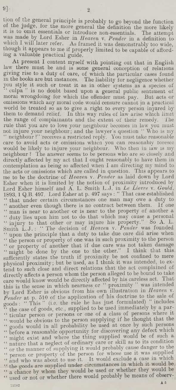 2 ion of the general principle is probably to go beyond the function of the judge, for the more general the definition the more likely it is to omit essentials or introduce non-essentials. The attempt was made by Lord Esher in Heaven v. Pender in a definition to which I will later refer. As framed it was demonstrably too wide, though it appears to me if properly limited to be capable of affording a valuable practical guide. At present I content myself with pointing out that in English law there must be and is some general conception of relations giving rise to a duty of care, of which the particular cases found in the books are but instances. The liability for negligence whether you style it such or treat it as in other systems as a species of “culpa” is no doubt based upon a general public sentiment of moral wrongdoing for which the defender must pay. But acts or omissions which any moral code would censure cannot in a practical world be treated so as to give a right to every person injured by them to demand relief. In this way rules of law arise which limit the range of complainants and the extent of their remedy. The rule that you are to love your neighbour becomes in law you must not injure your neighbour; and the lawyer's question “Who is my neighbour?” receives a restricted reply. You must take reasonable care to avoid acts or omissions which you can reasonably foresee would be likely to injure your neighbour. Who then in law is my neighbour? The answer seems to be persons who are so closely and directly affected by my act that I ought reasonably to have them in contemplation as being so affected when I am directing my mind to the acts or omissions which are called in question. This appears to me to be the doctrine of Heaven v. Pender as laid down by Lord Esher when it is limited by the notion of proximity introduced by Lord Esher himself and A. L. Smith L.J. in Le Lievre v. Gould, 1893, 1 Q.B. 497. Lord Esher at p. 497 says: “That case established that under certain circumstances one man owe a duty to another even though there is no contract between them. If one man is near to another or is near to the property of another a duty lies upon him not to do that which may cause a personal injury to that other or may injure his property.” So A. L. Smith L.J.: “The decision of Heaven v. Pender was founded upon the principle that a duty to take due care did arise when the person or property of one was in such proximity to the person or property of another that if due care was not taken damage might be done by the one to the other.” I think that this sufficiently states the truth if proximity be not confined to mere physical proximity; but be used, as I think it was intended, to extend to such close and direct relations that the act complained of directly affects a person whom the person alleged to be bound to take care would know would be directly affected by his careless act. That this is the sense in which nearness or “proximity” was intended by Lord Esher is obvious from his own illustration in Heaven v. Pender at p. 510 of the application of his doctrine to the sale of goods: “This” (i.e. the rule he has just formulated) “includes the case of goods, etc., supplied to be used immediately by a particular person or persons or one of a class of persons where it would be obvious to the person supplying if he thought that the goods would in all probability be used at once by such persons before a reasonable opportunity for discovering any defect which might exist and where the thing supplied would be of such a nature that a neglect of ordinary care or skill as to its condition or the manner of supplying it would probably cause danger to the person or property of the person for whose use it was supplied and who was about to use it. It would exclude a case in which the goods are supplied under circumstances in which it would be a chance by whom they would be used or whether they would be used or not or whether there would probably be means of observ-” |