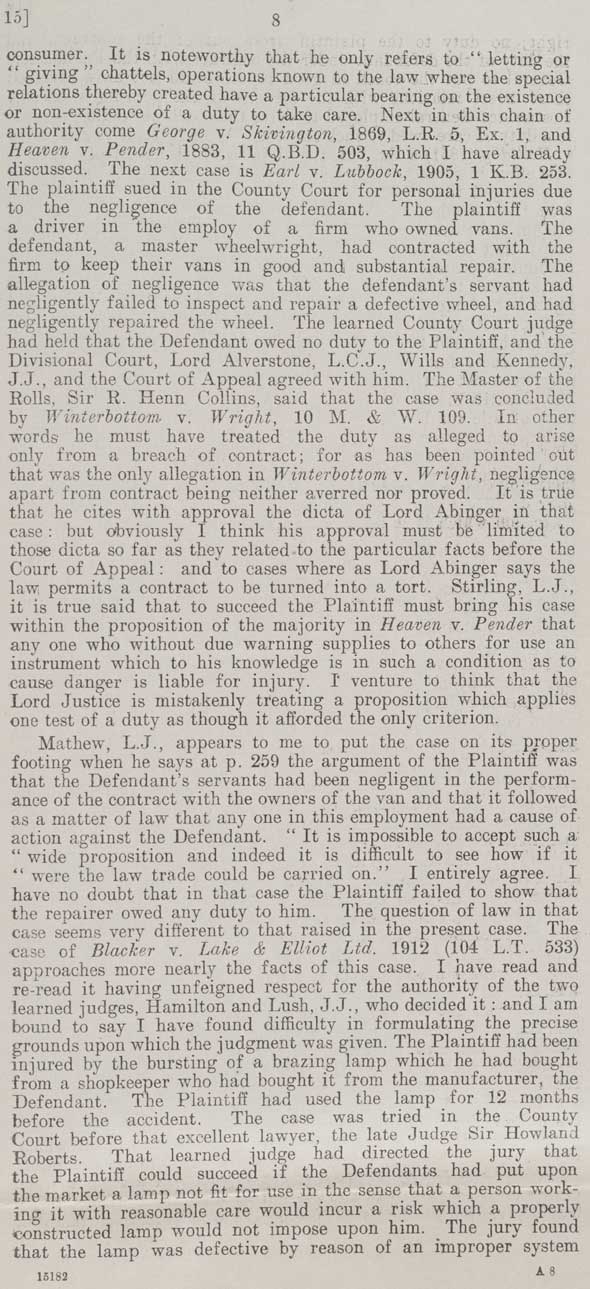 8 consumer. It is noteworthy that he only refers to “letting or giving” chattels, operations known to the law where the special relations thereby created have a particular bearing on the existence or non-existence of a duty to take care. Next in this chain of authority come George v. Skivington. 1869, L.R. 5, Ex. 1, and Heaven v.Pender, 1883, 11 Q.B.D. 503, which I have already discussed. The next case is Earl v. Lubbock, 1905, 1 K.B. 253. The plaintiff sued in the County Court for personal injuries due to the negligence of the defendant. The plaintiff was a driver in the employ of a firm who owned vans. The defendant, a master wheelwright, had contracted with the firm to keep their vans in good and substantial repair. The allegation of negligence was that the defendant's servant had negligently failed to inspect and repair a defective wheel, and had negligently repaired the wheel. The learned County Court judge had held that the Defendant owed no duty to the Plaintiff, and the Divisional Court, Lord Alverstone, L.C.J., Wills and Kennedy. J.J., and the Court of Appeal agreed with him. The Master of the Rolls, Sir R. Henn Collins, said that the case was concluded by Winterbottom v. Wright, 10 M. & W. 109. In other words, he must have treated the duty as alleged to arise only from a breach of contract; for as has been pointed out that was the only allegation in Winterbottom v. Wright, negligence apart from contract being neither averred nor proved. It is true that he cites with approval the dicta of Lord Abinger in that case: but obviously I think his approval must be limited to those dicta so far as they related to the particular facts before the Court of Appeal: and to cases whee as Lord Abinger says the law permits a contract to be turned into a tort. Stirling, L.J., it is true said that to succeed the Plaintiff must bring his case within the proposition of the majority in Heaven v. Pender that any one who without due warning supplies to others for use an instrument which to his knowledge is in such a condition as to cause danger is liable for injury. I venture to think that the Lord Justice is mistakenly treating a proposition which applies one test of a duty as though it afforded the only criterion. Mathew, L.J., appears to me to put the case on its proper footing when he says at p. 259 the argument of the Plaintiff was that the Defendant's servants had been negligent in the performance of the contract with the owners of the van and that it followed as a matter of law that any one in this employment had a cause of action against the Defendant. “It is impossible to accept such a wide proposition and indeed it is difficult to see how if it were the law trade could be carried on.” I entirely agree. I have no doubt that in that case the Plaintiff failed to show that the repairer owed any duty to him. The question of law in that case seems very different to that raised in the present case. The case of Blacker v. Lake & Elliot Ltd. 1912 (104 L.T. 533) approaches more nearly the facts of this case. I have read and re-read it having unfeigned respect for the authority of the two learned judges, Hamilton and Lush J.J., who decided it: and I am bound to say I have found difficulty in formulating the precise grounds upon which the judgment was given. The Plaintiff had been injured by the bursting of a brazing lamp which he had bought from a shopkeeper who had bought it from the manufacturer, the Defendant. The Plaintiff had used the lamp for 12 months before the accident. The case was tried in the County Court before that excellent lawyer, the late Judge Sir Howland Roberts. That learned judge had directed the jury that the Plaintiff could succeed if the Defendants had put upon the market a lamp not fit for use in the sense that a person working it with reasonable care would incur a risk which a properly constructed lamp would not impose upon him. The jury found that the lamp was defective by reason of an improper system |