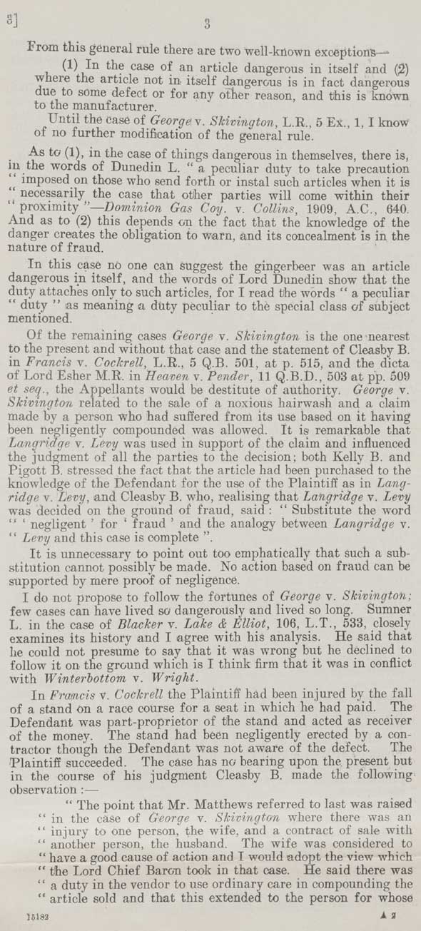 3 From this general rule there are two well-known exceptions— (1) In the case of an article dangerous in itself and (2) where the article not in itself dangerous is in fact dangerous due to some defect or for any other reason, and this is known to the manufacturer. As to (1), in the case of things dangerous in themselves, there is, in the words of Dunedin L. "a peculiar duty to take precaution imposed on those of send forth or instal such articles when it is necessarily the case that other parties will come within their proximity" — Dominion Gas Coy. v. Collins, 1909, A.C., 640. And as to (2) this depends on the fact that the knowledge of the danger creates the obligation to warn, and its concealment is in the nature of fraud. In this case no one can suggest the gingerbeer was an article dangerous in itself, and the words of Lord Dunedin show that the duty attaches only to such articles, for I read the words "a peculiar duty" as meaning a duty peculiar to the special class of subject mentioned. Of the remaining cases George v. Skivington is the one nearest to the present and without that case and the statement of Cleasby B. in Francis v. Cockrell, L.R. 5 Q.B. 501, at p. 515, and the dicta of Lord Esher M.R. in Heaven v. Pender, 11 Q.B.D., 503 at pp. 509 et seq., the Appellants would be destitute of authority. George v. Skivington related to the sale of a noxious hairwash and a claim made by a person who had suffered from its use based on it having been negligently compounded was allowed. It is remarkable that Langridge v. Levy was used in support of the claim and influenced the judgment of all the parties to the decision: both Kelly B. and Piggot B. stressed the fact that the article had been purchased to the knowledge of the Defendant for the use of the Plaintiff as in Langridge v. Levy, and Cleasby B. who, realising that Langridge v. Levy was decided on the ground of fraud, said: "Substitute the word 'negligent' for 'fraud' and the analogy between Langridge v. Levy and this case is complete". It is unnecessary to point out too emphatically that such a substitution cannot possibly be made. No action based on fraud can be supported by mere proof of negligence. I do not propose to follow the fortunes of George v. Skivington; few cases can have lived so dangerously and lived so long. Sumner L. in the case of Blacker v. Lake & Elliot, 106, L.T., 533., closely examines its history and I agree with his analysis. He said that he could no presume to say that it was wrong but he declined to follow it on the ground which is I think firm that it was in conflict with Winterbottom v. Wright. In Francis v. Cockrell the Plaintiff had been injured by the fall of a stand on a race course for a seat in which he had paid. The Defendant was part-proprietor of the stand and acted as receiver of the money. The stand had been negligently erected by a contractor though the Defendant was not aware of the defect. The Plaintiff succeeded. The case has no bearing upon the present but in the course of his judgment Cleaby B. made the following observation:— "The point that Mr. Matthews referred to last was raised in the case of George v. Skivington where there was an injury to one person, the wife, and a contract of sale with another person, the husband. The wife was considered to have a good cause of action and I would adopt the view which the Lord Chief Baron took in that case. He said there was a duty to the vendor to use ordinary care in compounding the article sold and that this extended to the person for whose |