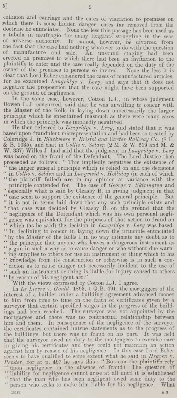 5 collision and carriage and the cases of visitation to premises on which there is some hidden danger, cases far removed from the doctrine he enunciates. None the less this passage has been used as a tabula in naufragio for many litigants struggling in the seas of adverse authority. It cannot, however, be divorced from the fact that the case had nothing to do with the question of manufacture and sale. An unsound staging had been erected on premises to which there had been an invitation to the plaintiffs to enter and the case really depended on the duty of the owner of the premises to persons so invited. None the less it is clear that Lord Esher considered the cases of manufactured articles, for he examined Langridge v. Levy, and says that it does not negative the proposition that the case might have been supported on the ground of negligence. In the same case, however, Cotton L.J., in whose judgment Bowen L.J. concurred, said that he was unwilling to concur with the Master of the Rolls in laying down unnecessarily the larger principle which he entertained inasmuch as there were many cases in which the principle was impliedly negatived. He then referred to Langridge v. Levy, and stated that it was based upon fraudulent misrepresentation and had been so treated by Coleridge J. in Blackmore v. Bristol and Exeter Railway Co. (8 E. & B. 1035), and that in Collis v. Selden (2 M. & W. 519 and M. & W. 337) Willes J. had said that the judgment in Langridge v. Levy was based on the fraud of the Defendant. The Lord Justice then proceeded as follows: "This impliedly negatives the existence of the larger general principle which is relied on and the decisions in Collis v. Selden and in Langmeid v. Holliday (in each of which the plaintiff failed) are in my opinion at variance with the principle contended for. The case of George v. Skivington and especially what is said by Cleasby B. in giving judgment in that case seem to support the existence of the general principle. But it is not in terms laid down that any such principle exists and that case was decided by Cleasby B. on the ground that the negligence of the Defendant which was his own personal negligence was equivalent for the purposes of that action to fraud on which (as he said) the decision in Langridge v. Levy was based. In declining to concur in laying down the principle enunciated by the Master of the Rolls I in no way intimate any doubt as to the principle that anyone who leaves a dangerous instrument as a gun in such a way as to cause danger or who without due warning supplies to others for use an instrument or thing which to his knowledge from its construction or otherwise is in such a condition as to cause danger not necessarily incident to the use of such an instrument or thing is liable for injury caused to others by reason of his negligent act." With the views expressed by Cotton L.J. I agree. In Le Lievre v. Gould, 1893, 1 Q.B. 491, the mortgagees of the interest of a builder under a building agreement advanced money to him from time to time on the faith of certificates given by a surveyor that certain specified stages in the progress of the buildings had been reached. The surveyor was not appointed by the mortgagees and there was no contractual relationship between him and them. In consequence of the negligence of the surveyor the certificates contained untrue statements as to the progress of the buildings, but there was no fraud on his part. It was held that the surveyor owned no duty to the mortgagees to exercise care in giving his certificates and they could not maintain an action against him by reason of his negligence. In this case Lord Esher seems to have qualified to some extent what he said in Heaven v. Pender, for at p. 497 he says this: "But can the plaintiffs rely upon negligence in the absence of fraud? The question of liability for negligence cannot arise at all until it is established that the man who has been negligent owed some duty to the person who seeks to make him liable for his negligence. What |