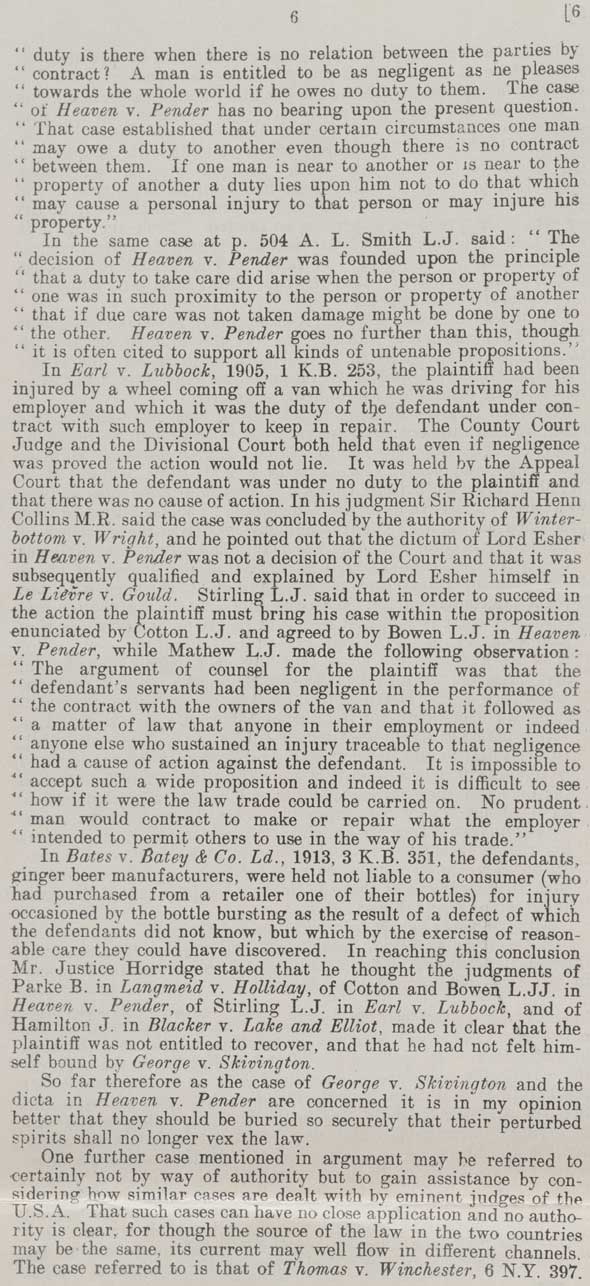 6 duty is there when there is no relation between the parties by contract? A man is entitled to be as negligent as he pleases towards the whole world if he owes no duty to them. The case of Heaven v. Pender has no bearing upon the present question. That case established that under certain circumstances one man may owe a duty to another even though there is no contract between them. If one man is near to another or is near to the property of another a duty lies upon him not to do that which may cause a personal injury to that person or may injure his property." In the same case at p. 504 A. L. Smith L.J. said: "The decision of Heaven v. Pender was founded upon the principle that a duty to take care did arise when the person or property of one was in such proximity to the person or property of another that if due care was not taken damage might be done by one of the other. Heaven v. Pender goes no further than this, though it is often cited to support all kinds of untenable propositions." In Earl v. Lubbock, 1905, 1 K.B. 253, the plaintiff had been injured by a wheel coming off a van which he was driving for his employer and which it was the duty of the defendant under contract with such employer to keep in repair. The County Court Judge and the Divisional Court both held that even if negligence was proved the action would not lie. It was held by the Appeal Court that the defendant was under no duty to the plaintiff and that there was no cause of action. In his judgment Sir Richard Henn Collins M.R. said the case was concluded by the authority of Winterbottom v. Wright, and he pointed out that the dictum of Lord Esher in Heaven v. Pender was not a decision of the Court and that it was subsequently qualified and explained by Lord Esher himself in Le Lievre v. Gould. Stirling L.J. said that in order to succeed in the action the plaintiff must bring his case within the proposition enunciated by Cotton L.J. and agreed to by Bowen L.J. in Heaven v. Pender, while Matthew L.J. made the following observation: "The argument of counsel for the plaintiff was that the defendant's servants had been negligent in the performance of the contract with the owners of the van and that it followed as a matter of law that anyone in their employment or indeed anyone else who sustained an injury traceable to that negligence had a cause of action against the defendant. It is impossible to accept such a wide proposition and indeed it is difficult to see how if it were the law trade could be carried on. No prudent man would contract to make or repair what the employer intended to permit others to use in the way of his trade." In Bates v. Batey & Co. Ld., 1913, 3 K.B. 351, the defendants, ginger beer manufacturers, were held not liable to a consumer (who had purchased from a retailer one of their bottles) for injury occasioned by the bottle bursting as the result of a defect of which the defendants did not know, but which by the exercise of reasonable care they could have discovered. In reaching this conclusion Mr. Justice Horridge stated that he thought the judgments of Parke B. in Langmeid v. Holliday, of Cotton and Bowen L.JJ. in Heaven v. Pender, of Stirling L.J. in Earl v. Lubbock, and of Hamilton J. in Blacker v. Lake and Elliot, made it clear that the plaintiff was not entitled to recover, and that he had not felt himself bound by George v. Skivington. So far therefore as the case of George v. Skivington and the dicta in Heaven v. Pender are concerned it is in my opinion better that they should be buried so securely that their perturbed spirits shall no longer vex the law. One further case mentioned in argument may be referred to certainly not by way of authority but to gain assistance by considering how similar cases are dealt with by eminent judges of the U.S.A. That such cases can have no close application and no authority is clear, for though the source of the law in the two countries may be the same, its current may well flow in different channels. The case referred to is that of Thomas v. Winchester, 6 N.Y. 397. |