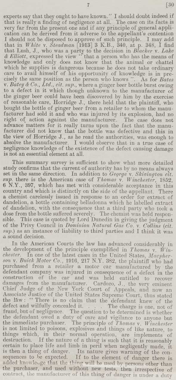7 experts say that they ought to have known." I should doubt indeed if that is really a finding of negligence at all. The case in its facts is very far from the present one and if any principle of general application can be derived from it adverse to the appellant's contention I should be be disposed to approve of such principle. I may add that in White v. Steadman [1913] 3 K.B., 340, at p. 348, I find that Lush, J., who was a party to the decision in Blacker v. Lake & Elliott, expressed the view "that a person who has the means of knowledge and only does not know that the animal or chattel which he supplies is dangerous because he does not take ordinary care to avail himself of his opportunity of knowledge is in precisely the same position as the person who knows". As for Bates v. Batey & Co., Ltd., cit. sup., where a ginger beer bottle burst owing to a defect in it which though unknown to the manufacturer of the ginger beer could have been discovered by him by the exercise of reasonable care, Horridge J., there held that the plaintiff, who bought the bottle of ginger beer from a retailer to whom the manufacturer had sold it and who was injured by its explosion, had no right of action against the manufacturer. The case does not advance matters for it really turns upon the fact that the manufacturer did not know that the bottle was defective and this in the view of Horridge J., as he read the authorities, was enough to absolve the manufacturer. I would observe that in a true case of negligence knowledge of the existence of the defect causing damage is not an essential element at all. This summary survey is sufficient to show what more detailed study confirms that the current authority has by no means always set in the same direction. In addition to George v. Skivington cit. sup. there is the American case of Thomas v. Winchester, 1852, 6 N.Y., 397, which has met with considerable acceptance in this country and which is distinctly on the side of the appellant. There a chemist carelessly issued in response to an order for extract of dandelion, a bottle containing belladonna which he labelled extract of dandelion, with the consequence that a third party who took a dose from the bottle suffered severely. The chemist was held responsible. This case is quoted by Lord Dunedin in giving judgment of the Privy Council in Dominion Natural Gas Co. v. Collins (cit. sup.) as an instance of liability to third parties and I think it was a sound decision. In the American Courts the law has advanced considerably in the development of the principle exemplified in Thomas v. Winchester. In one of the latest cases in the United States, Macpherson v. Buick Motor Co., 1916, 217 N.Y. 382, the plaintiff who had purchased from a retailer a motor car manufactured by the defendant company was injured in consequence of a defect in the construction of the car and was held entitled to recover damages from the manufacturer. Cardozo, J., the very eminent Chief Judge of the New York Court of Appeals, and now an Associate Justice of the United States Supreme Court, thus stated the law: "There is no claim that the defendant knew of the defect and wilfully concealed it. … The charge is one, not of fraud, but of negligence. The question to be determined is whether the defendant owed a duty of care and vigilance to anyone but the immediate purchaser. The principle of Thomas v. Winchester is not limited to poisons, explosives and things of like nature, to things which in their normal operation, are implements of destruction. If the nature of a thing is such that it is reasonably certain to place life and limb in peril when negligently made, it is then a thing of danger. Its nature gives warning of the consequences to be expected. If to the element of danger there is added knowledge that the thing will be used by persons other than the purchaser, and used without new tests, then irrespective of contract, the manufacturer of this thing of danger is under a duty |
