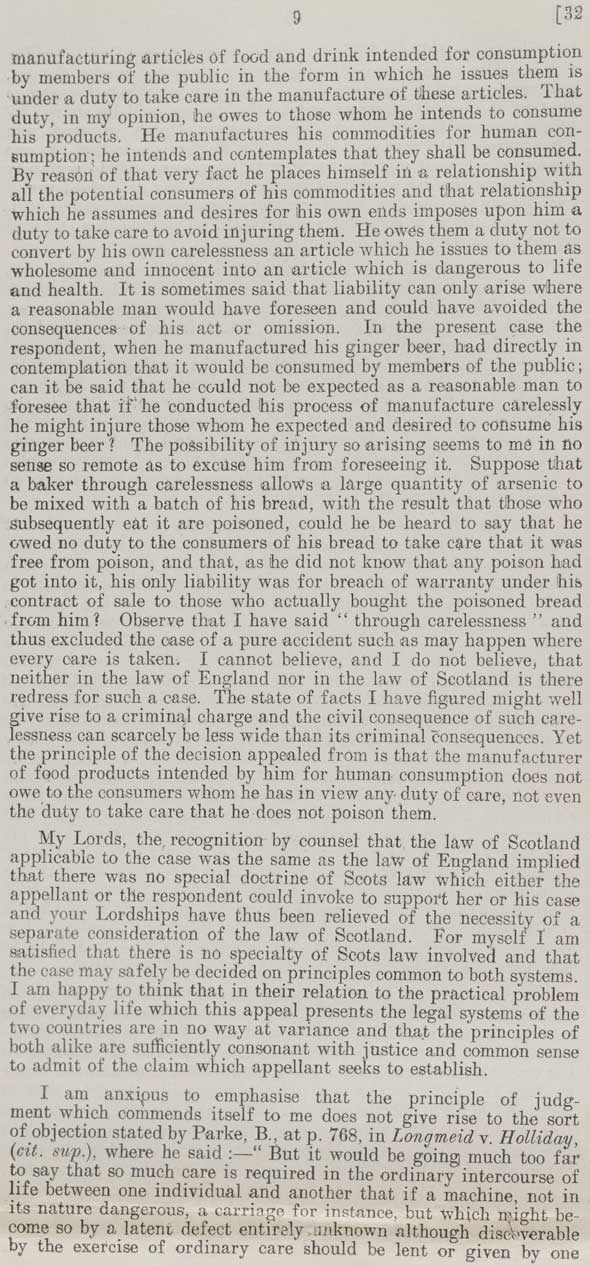 9 manufacturing articles of food and drink intended for consumption by members of the public in the form in which he issues them is under a duty to take care in the manufacture of these articles. That duty, in my opinion, he owes to those whom he intends to consume his products. He manufactures his commodities for human consumption; he intends and contemplates that they shall be consumed. By reason of that very fact he places himself in a relationship with all the potential consumers of his commodities and that relationship which he assumes and desires for his own ends imposes upon him a duty to take care to avoid injuring them. He owes them a duty not to convert by his own carelessness an article which he issues to them as wholesome and innocent into an article which is dangerous to life and health. It is sometimes said that liability can only arise where a reasonable man would have foreseen and could have avoided the consequences of his act or omission. In the present case the respondent, when he manufactured his ginger beer, had directly in contemplation that it would be consumed by members of the public; can it be said that he could not be expected as a reasonable man to foresee that if he conducted his process of manufacture carelessly he might injure those whom he expected and desired to consume his ginger beer? The possibility of injury so arising seems to me in no sense so remote as to excuse him from foreseeing it. Suppose that a baker through carelessness allows a large quantity of arsenic to be mixed with a batch of his bread, with the result that those who subsequently eat it are poisoned, could he be heard to say that he owed no duty to the consumers of his bread to take care that it was free from poison, and that, as he did not know that any poison had got into it, his only liability was for breach of warranty under his contract of sale to those who actually bought the poisoned bread from him? Observe that I have said "through carelessness" and thus excluded the case of a pure accident such as may happen where every care is taken. I cannot believe, and I do not believe, that neither in the law of England nor in the law of Scotland is there redress for such a case. The state of facts I have figured might well give rise to a criminal charge and the civil consequences of such carelessness can scarcely be less wide than its criminal consequences. Yet the principle of the decision appealed from is that the manufacturer of food products intended by him for human consumption does not owe to the consumers whom he has in view any duty of care, not even the duty to take care that he does not poison them. My Lords, the recognition by counsel that the law of Scotland applicable to the case was the same as the law of England implied that there was no special doctrine of Scots law which either the appellant or the respondent could invoke to support her of his case and your Lordships have thus been relieved of the necessity of a separate consideration of the law of Scotland. For myself I am satisfied that there is no specialty of Scots law involved and that the case may safely be decided on principles common to both systems. I am happy to think that in their relation to the practical problem of everyday life which this appeal presents the legal systems of the two countries are in no way at variance and that the principles of both alike are sufficiently consonant with justice and common sense to admit of the claim which appellant seeks to establish. I am anxious to emphasise that the principle of judgment which commends itself to me does not give rise to the sort of objection stated by Parke, B., at p. 768, in Longmeid v. Holliday, (cit. sup.), where he said:— "But it would be going much too far to say that so much care is required in the ordinary intercourse of life between one individual and another that if a machine, not in its nature dangerous, a carriage for instance, but which might become so by a latent defect entirely unknown although discoverable by the exercise of ordinary care should be lent or given by one |