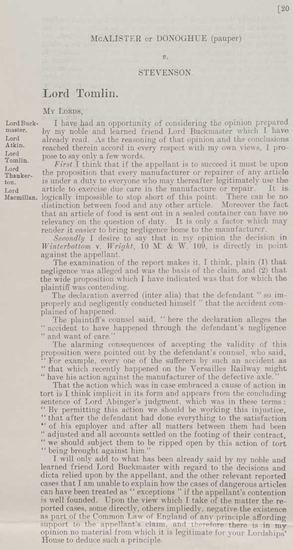 McALISTER or DONOGHUE (pauper) Lord Tomlin. MY LORDS, I have had an opportunity of considering the opinion prepared by my noble and learned friend Lord Buckmaster which I have already read. As the reasoning of the opinion and the conclusions reached therein accord in every respect with my own views, I propose to say only a few words. First I think that if the appellant is to succeed it must be upon the proposition that every manufacturer or repairer of any article is under a duty to everyone who may thereafter legitimately use the article to exercise due care in the manufacture or repair. It is logically impossible to stop short of this point. There can be no distinction between food and any other article. Moreover the fact that an article of food is sent out in a sealed container can have no relevancy on the question of duty. It is only a factor which may render it easier to bring negligence home to the manufacturer. Secondly I desire to say that in my opinion the decision in Winterbottom v. Wright, 10 M: & W. 109, is directly in point against the appellant. The examination of the report makes it, I think, plain (1) that negligence was alleged and was the basis of the claim, and (2) that the wide proposition which I have indicated was that for which the plaintiff was contending. The declaration averred (inter alia) that the defendant “so improperly and negligently conducted himself” that the accident complained of happened. The plaintiff’s counsel said, “here the declaration alleges the accident to have happened through the defendant’s negligence and want of care.” The alarming consequences of accepting the validity of this proposition were pointed out by the defendant’s counsel, who said, “For example, every one of the sufferers by such an accident as that which recently happened on the Versailles Railway might have his action against the manufacturer of the defective axle.” That the action which was in case embraced a cause of action in tort is I think implicit in its form and appears from the concluding sentence of Lord Abinger’s judgment, which was in these terms: “By permitting this action we should be working this injustice, that after the defendant had done everything to the satisfaction of his employer and after all matters between them had been adjusted and all accounts settled on the footing of their contract, we should subject them to be ripped open by this action of tort being brought against him.” I will only add to what has been already said by my noble and learned friend Lord Buckmaster with regard to the decisions and dicta relied upon by the appellant, and the other relevant reported cases that I am unable to explain how the cases of dangerous articles can have been treated as “exceptions” if the appellant’s contention is well founded. Upon the view which I take of the matter the reported cases, some directly, others impliedly, negative the existence as part of the Common Law of England of any principle affording support to the appellant’s claim, and therefore there is in my opinion no material from which it is legitimate for your Lordships’ House to deduce such a principle. |