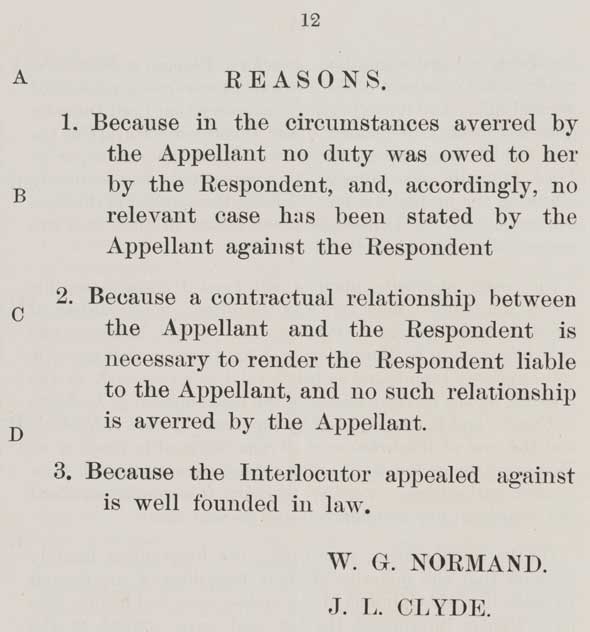 Because in the circumstances averred by the Appellant no duty was owed to her by the Respondent, and, accordingly, no relevant case has been stated by the Appellant against the Respondent