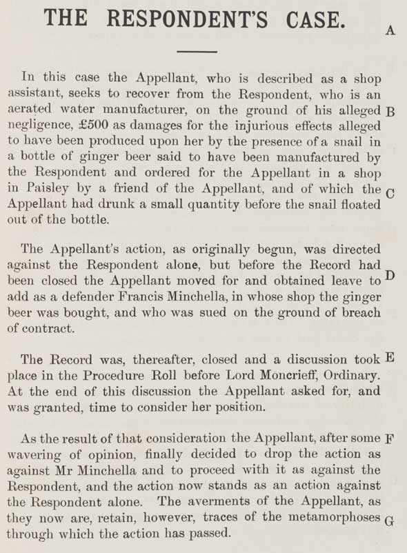 THE RESPONDENT’S CASE. In this case the Appellant, who is described as a shop assistant, seeks to recover from the Respondent, who is an aerated water manufacturer, on the ground of his alleged negligence, £500 as damages for the injurious effects alleged to have been produced upon her by the presence of a snail in a bottle of ginger beer said to have been manufactured by the Respondent and ordered for the Appellant in a shop in Paisley by a friend of the Appellant, and of which the Appellant had drunk a small quantity before the snail floated out of the bottle. The Appellant's action, as originally begun, was directed against the Respondent alone, but before the Record had been closed the Appellant moved for and obtained leave to add as a defender Francis Minchella, in whose shop the ginger beer was bought, and who was sued on the ground of breach of contract. The Record was, thereafter, closed and a discussion took place in the Procedure Roll before Lord Moncrieff, Ordinary. At the end of this discussion the Appellant asked for, and was granted, time to consider her position. As the result of that consideration the Appellant, after some wavering of opinion, finally decided to drop the action as against Mr Minchella and to proceed with it as against the Respondent, and the action now stands as an action against the Respondent alone. The averments of the Appellant, as they now are, retain, however, traces of the metamorphoses through which the action has passed. |