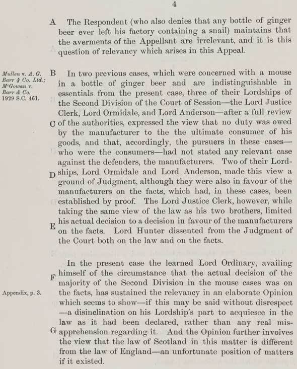 4 The Respondent (who also denies that any bottle of ginger beer ever left his factory containing a snail) maintains that the averments of the Appellant are irrelevant, and it is this question of relevancy which arises in this Appeal. |