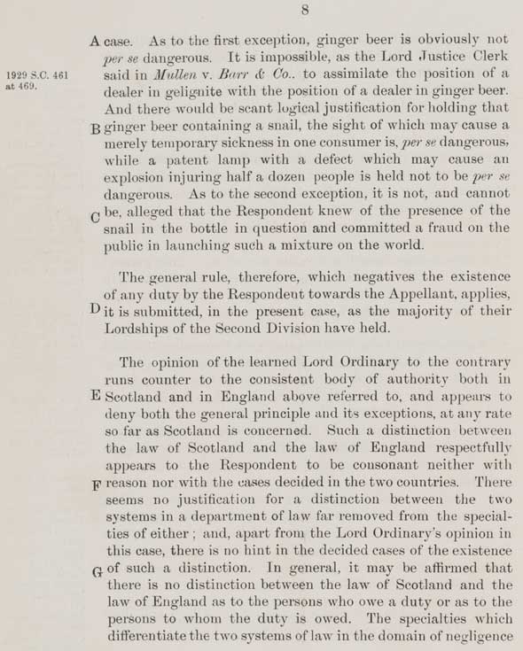 8 case. As to the first exception, ginger beer is obviously not per se dangerous. It is impossible, as the Lord Justice Clerk said in Mullen v. Barr & Co., to assimilate the position of a dealer in gelignite with the position of a dealer in ginger beer. And there would be scant logical justification for holding that ginger beer containing a snail, the slight of which may cause a merely temporary sickness in one consumer is, per se dangerous, while a patent lamp with a defect which may cause an explosion injuring half a dozen people is held not to be per se dangerous. As to the second exception, it is not, and cannot be, alleged that the Respondent knew of the presence of the snail in the bottle in question and committed a fraud on the public in launching such a mixture on the world. The general rule, therefore, which negatives the existence of any duty by the Respondent towards the Appellant, applies, it is submitted, in the present case, as the majority of their Lordships of the Second Division have held. The opinion of the learned Lord Ordinary to the contrary runs counter to the consistent body of authority both in Scotland and in England above referred to, and appears to deny both the general principle and its exceptions, at any rate so far as Scotland is concerned. Such a distinction between the law of Scotland and the law of England respectfully appears to the Respondent to be consonant neither with reason nor with the cases decided in the two countries. There seems no justification for a distinction between the two systems in a department of law far removed from the specialties of either; and, apart from the Lord Ordinary's opinion in this case, there is no hint in the decided cases of the existence of such a distinction. In general, it may be affirmed that there is no distinction between the law of Scotland and the law of England as to the persons who owe a duty or as to the persons to whom the duty is owed. The specialties which differentiate the two systems of law in the domain of negligence |