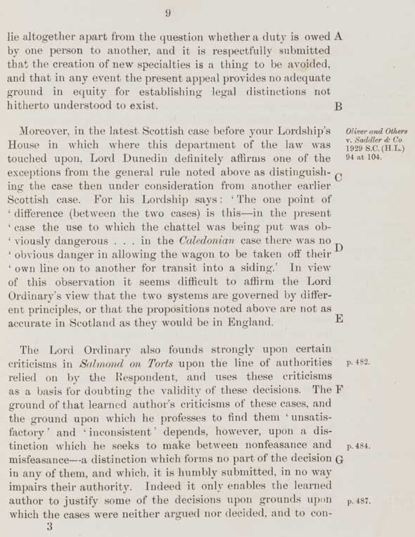 | The Lord Ordinary also founds strongly upon certain criticisms in Salmond on Torts upon the line of authorities relied on by the Respondents, and uses these criticisms as a basis for doubting the validity of these decisions. The ground of that learned author's criticisms of these cases, and the ground upon which he professes to find them 'unsatisfactory' and 'inconsistent' depends, however, upon a distinction which he seeks to make between nonfeasance and misfeasance — a distinction which forms no part of the decision in any of them, and which, it is humbly submitted, in no way impairs their authority. Indeed it only enables the learned author to justify some of the decisions upon grounds upon which the cases were neither argued nor decided, and to con- | p.482. p.484. p.487. |