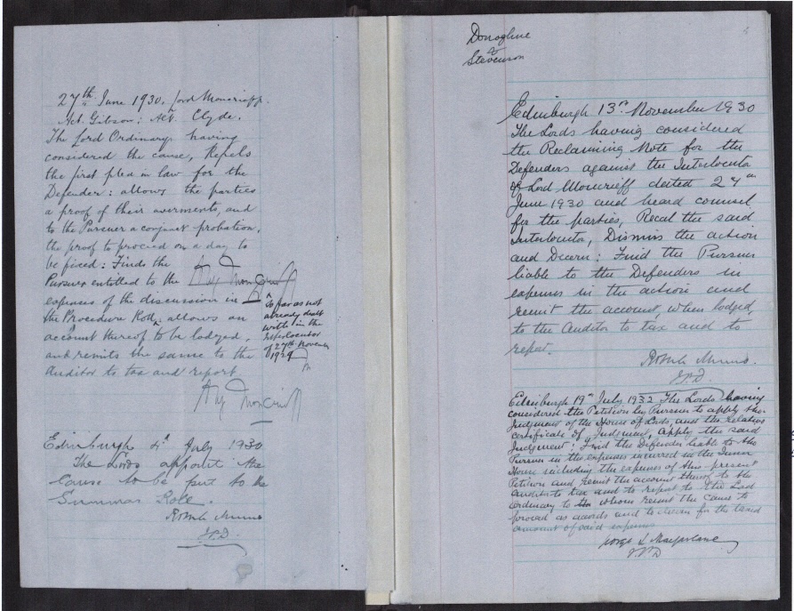 - July 19, 1932. Action referred back for trial to Lord Moncrieff whose pretrial decision had been upheld two months earlier by the House of Lords.