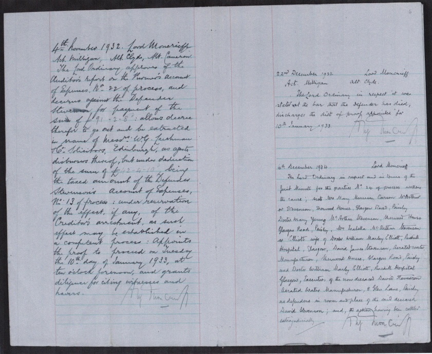 - November 6, 1934. Lord Moncrieff: (a) recognizes Stevenson’s executors as acting in his place, (b) by reason of “the action having been settled extrajudicially, assoilizes the defenders from the conclusion of the Summons and discerns”, and (c) finds “no expenses due to or by either party.”